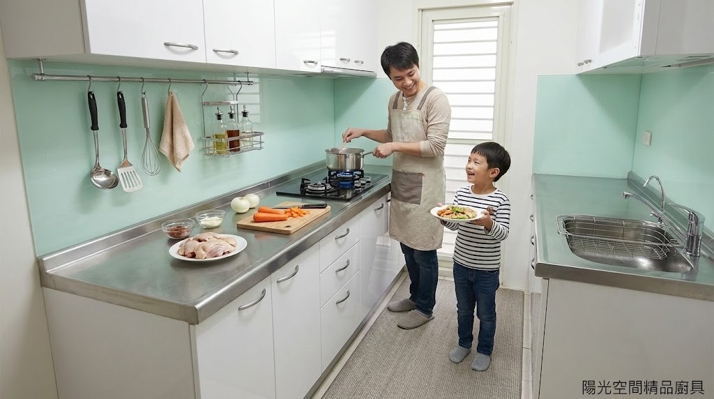 不銹鋼檯面只要做到 6cm 厚度,質感完全不同!搭配白色玻璃爐、隱藏式排油煙機與烤漆玻璃,一字型廚房瞬間從「基本款」變「設計款」。