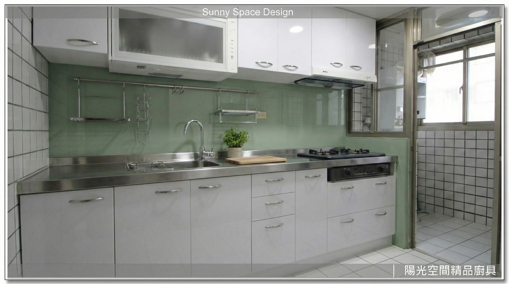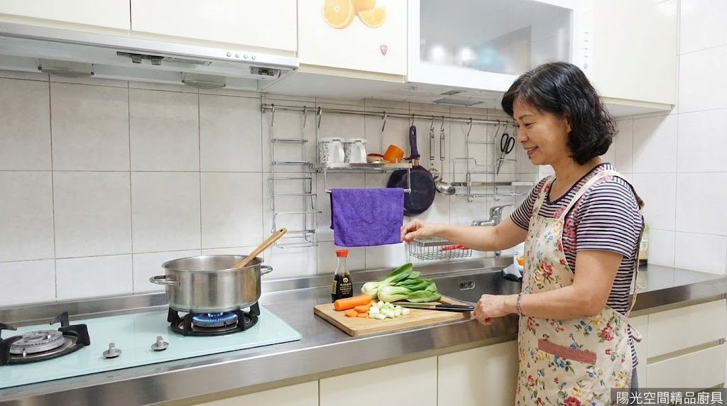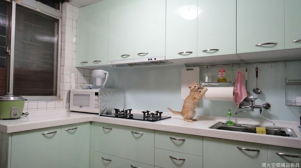淡雅綠水晶門板搭配淺色烤漆玻璃,讓整體廚房呈現溫柔舒服的視覺。配置轉角補板、櫻花家電與防蟑防臭水槽,是兼具質感與實用性的 L 型廚房。