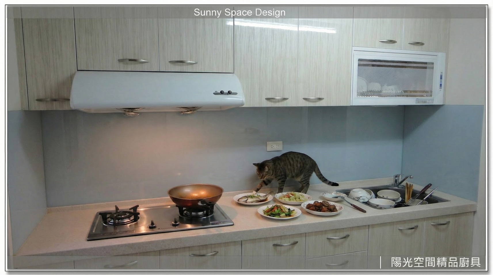 372 公分一字型廚具,搭配 6 公分厚不銹鋼檯面與 45 度斜把手設計,上疊櫃大幅提升收納量,並以腳柱取代踢腳板,兼顧美感與清潔便利,是一套耐用、整齊又實用的長型廚房配置。