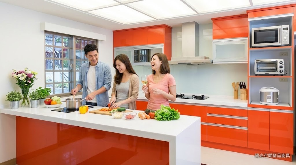 ㄇ字型主廚房搭配 240cm 中島,鮮豔橘色 6面鋼烤門板在素雅空間中大器亮眼。大量收納、雙層上櫃、拉籃規劃完整,並搭配林內、豪山、喜特麗等多樣家電,呈現專為愛下廚家庭打造的豪宅級廚房。