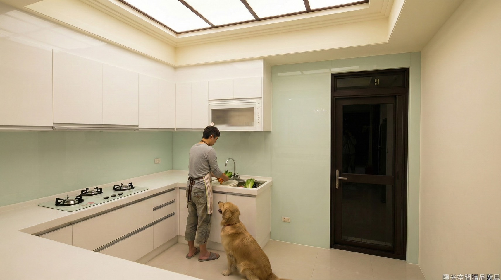 因應樓梯下特殊地形,將水槽與爐具分區配置,搭配韓國人造石檯面與水晶門板,空間不擁擠、動線更順。局部烤漆玻璃設計,兼顧美感與清潔實用性,證明空間有限也能擁有好廚房。
