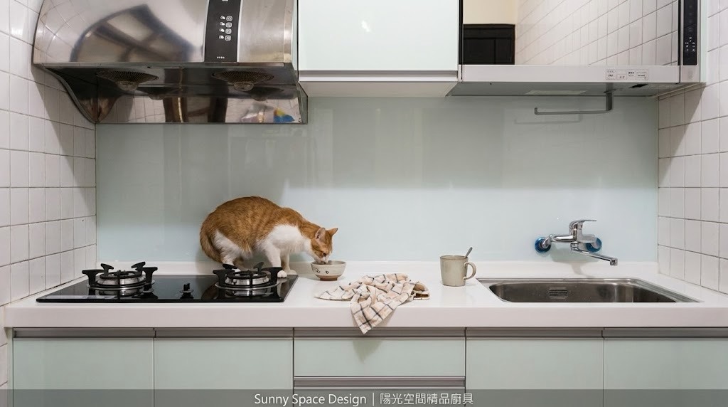桃園博愛街邱先生一字型廚具(212cm),由傳統分件式廚具升級為歐化系統廚具。採用韓國人造石檯面、木心板桶身與水晶門板,搭配 C 型崁鋁把手;瓦斯爐改為檯面式並於牆面貼烤漆玻璃,有效減少清潔死角,讓完工成果與設計圖高度一致,質感與實用兼顧。