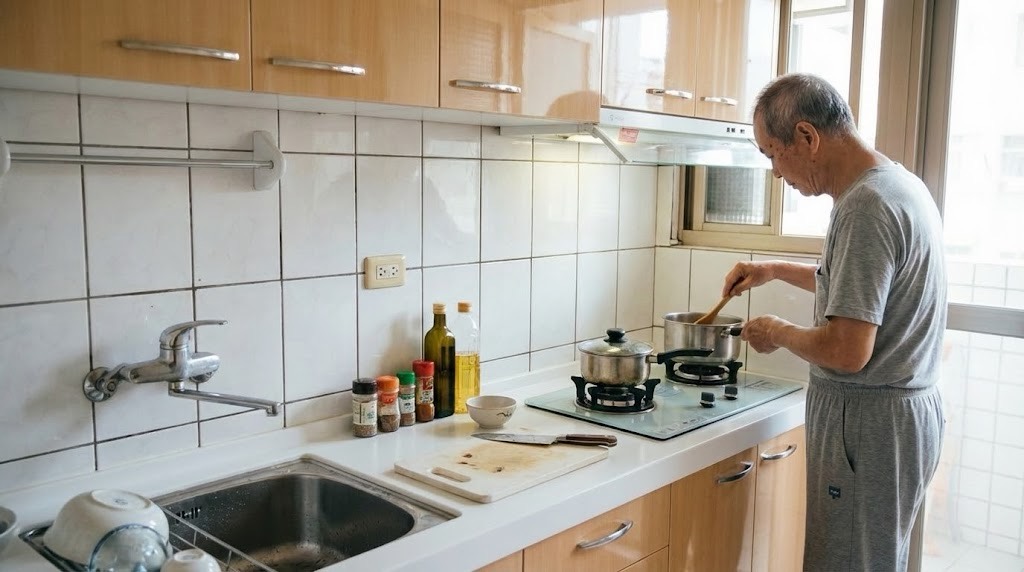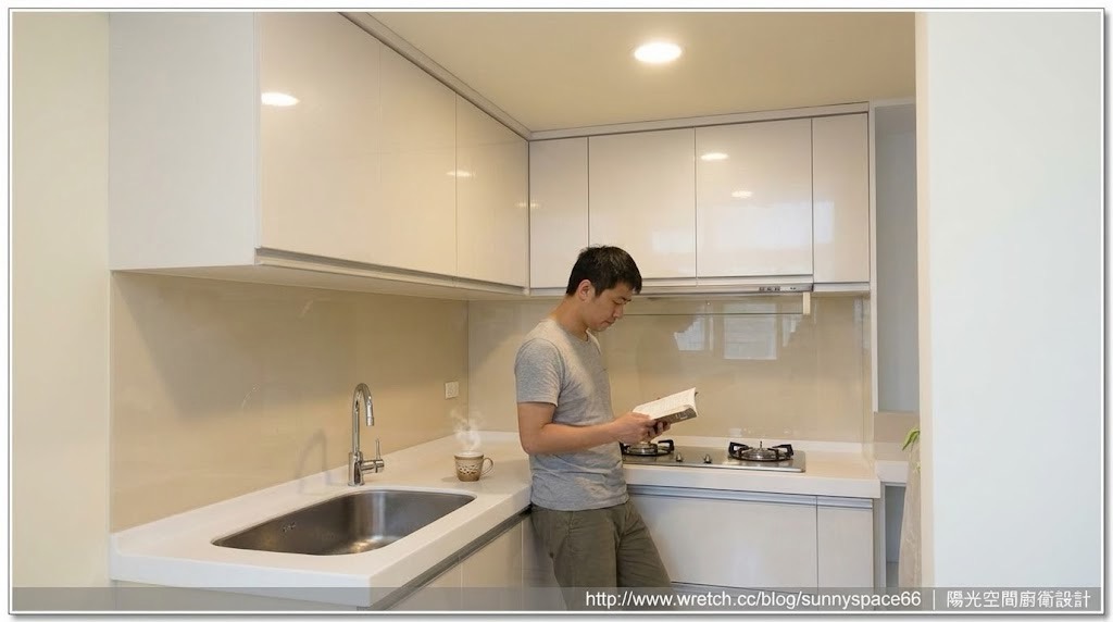 板橋華江一路謝小姐一字型廚具,尺寸 253cm。檯面特別加深至 67cm,搭配上櫃底部層光燈,完整解決料理時切菜照明不足問題。選用矽鋼石檯面與六面結晶鋼烤門板,搭配林內頂側雙吸排油煙機與 ASKO 洗碗機,實用與機能兼顧。