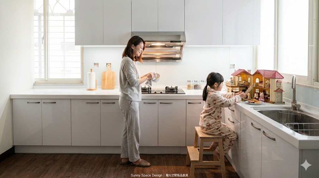 每次從中部娘家要回台北,車廂永遠塞滿:老媽醃肉、阿姨芒果、鄰居水果醋、三舅媽肉粽、嬸嬸自家菜園的青菜……長輩總覺得冰箱裡的一切都該讓你帶回去。回家就是爽,小孩餓了、無聊了、要換尿布,全都是「去找阿嬤」就解決。 今天這套廚具,就是專為這種「回家當蛋黃哥、假裝單身的媽媽」打造——簡單、好清潔、耐用、省心,一字型 221cm 小廚房,也能煮出家的味道。