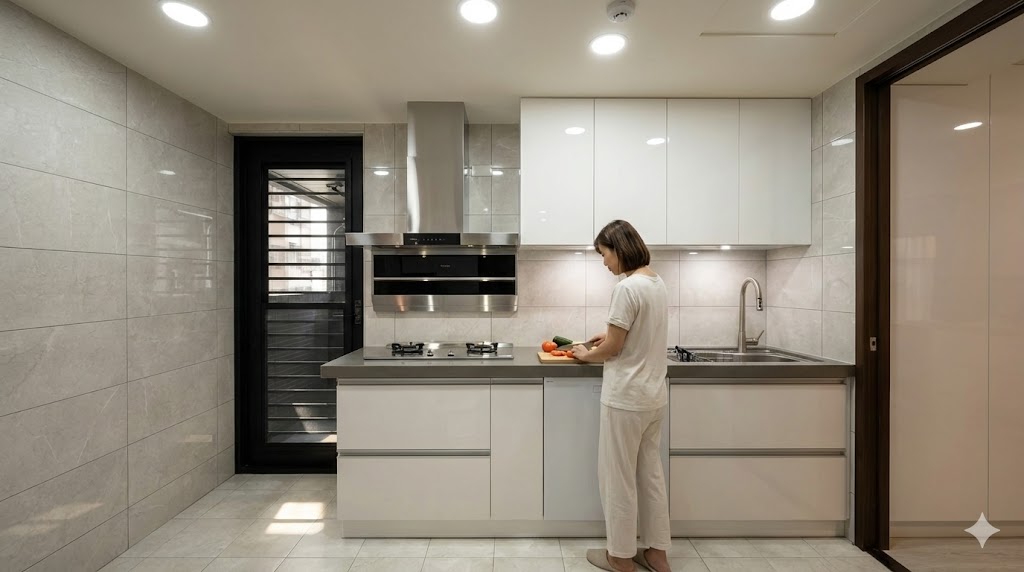 這套一字型 272cm 加 85cm 電器櫃的廚具,以矽鋼石 SI-105 搭配淺木紋與霧灰檯面,打造溫柔中性的「好好吃飯廚房」。現場有天然瓦斯管、光線不足與收納需求,我們透過補板閃管、T5 層光燈、踢腳板抽、凹型拉籃與 85cm 大電器櫃規劃,再搭配櫻花渦輪變頻抽油煙機、雙口玻璃爐與韓國防蟑防臭水槽,讓屋主可以用平常心面對生活,好好煮飯、好好吃飯。