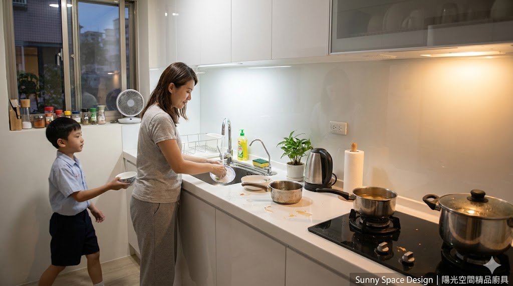 新北市樹林東榮街戴小姐家的這套一字形 242cm 漫畫廚具,以純白水晶門板搭配方格磁磚,彷彿走進黑白漫畫場景。搭配韓國人造石檯面 PF812、櫻花近吸除油煙機 R7600、二口檯面爐與 DANCO 鋁抽、調味側拉架與嵌門烘碗機,讓小廚房在俐落線條中兼具收納、機能與質感。